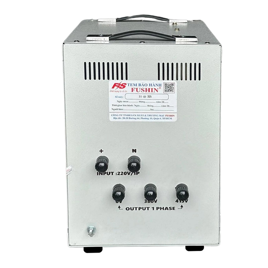 Đây là thiết bị dùng để biến đổi (nâng áp) từ nguồn điện lưới 220V chuẩn 1 pha lên mức điện áp 380V hoặc 415V (1 pha) để cấp nguồn cho các thiết bị đặc biệt mà không cần kéo nguồn 3 pha. Với công suất 7.5kVA, máy đáp ứng tốt cho các nhu cầu tải vừa và nhỏ.