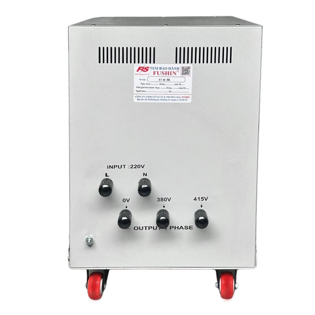 Đây là thiết bị biến đổi điện áp (nâng áp) công suất lớn, chuyển đổi nguồn điện vào 220V (1 pha) thành nguồn điện ra 380V hoặc 415V (1 pha). Với công suất lên đến 20kVA, máy có thể đáp ứng được các phụ tải lớn, hoạt động liên tục với cường độ cao.
